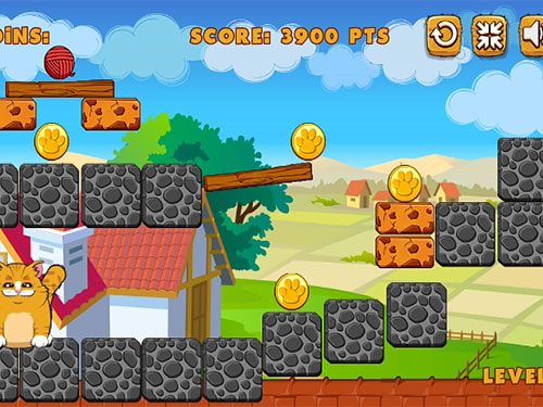 Click breakable objects to destroy them and get the ball to the kitty, collect coins (maximum 3 for level), make movable objects fall to get to next level!